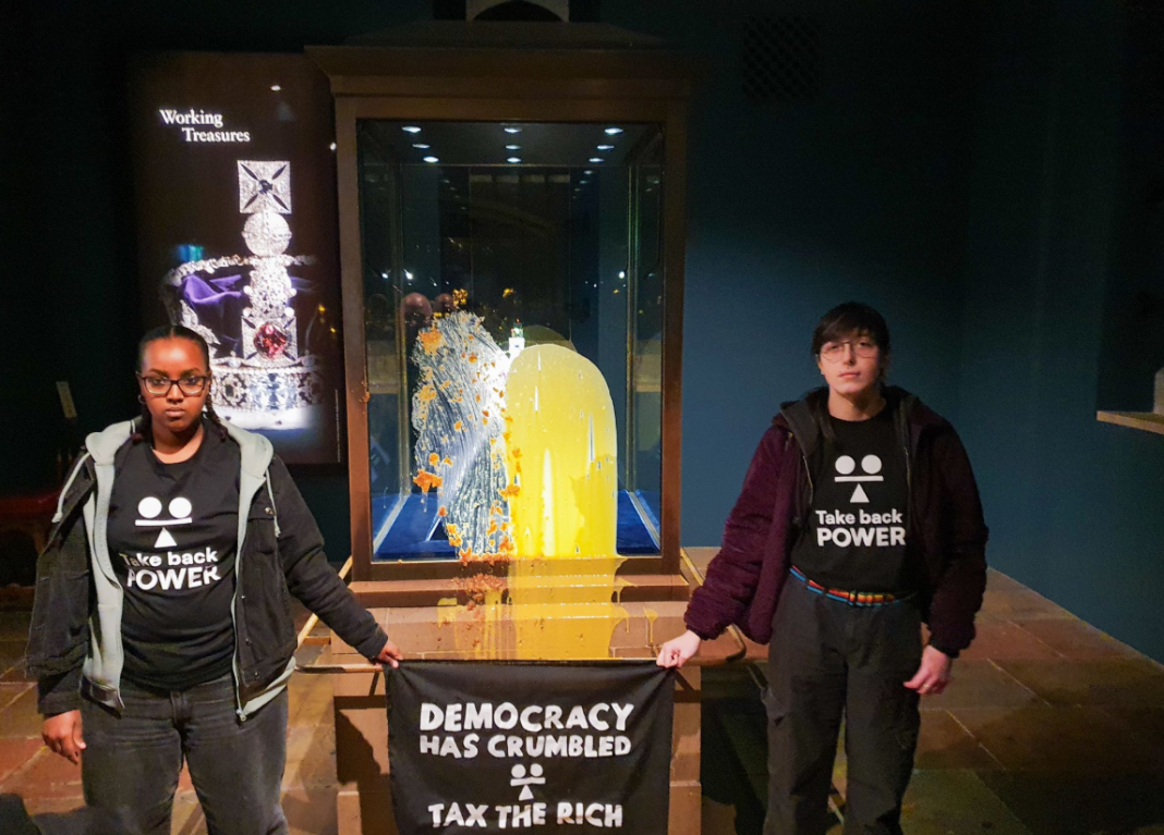Pe lângă plăcintă, sau mai degrabă crumble (o rețetă pentru această prăjitură poate fi găsită pe BBC), activiștii au adus la muzeu un recipient cu cremă de vanilie, pe care au turnat-o și peste vitrina în care se afla coroana.