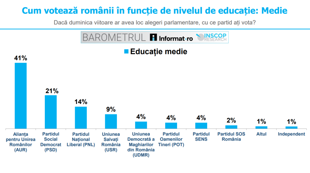 În rândul celor cu educație medie, AUR se menține lider, cu 41%, urmat de PSD (21%), PNL (14%), USR (9%) și UDMR (4%).