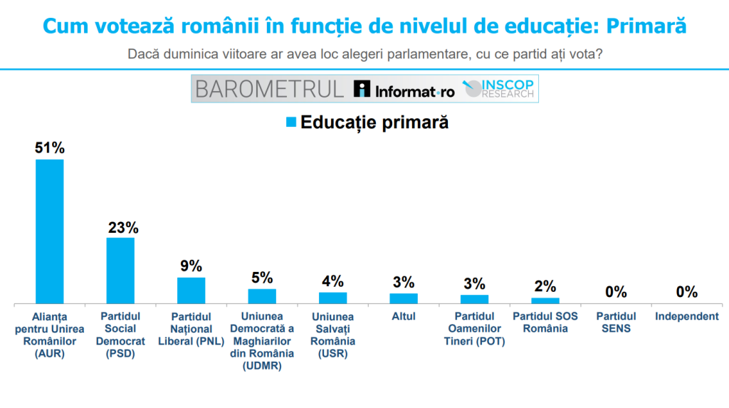 Datele sondajului arată că 51% dintre persoanele cu educație primară ar vota cu AUR dacă duminica viitoare ar avea loc alegeri parlamentare.