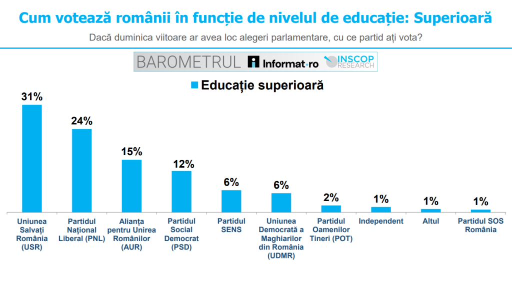 Printre alegătorii cu educație superioară, topul partidelor se schimbă semnificativ: 31% dintre respondenți ar vota cu USR, 24% cu PNL, 15% cu AUR, 12% cu PSD, 6% cu SENS, 6% cu UDMR, iar restul pentru POT sau candidați independenți.