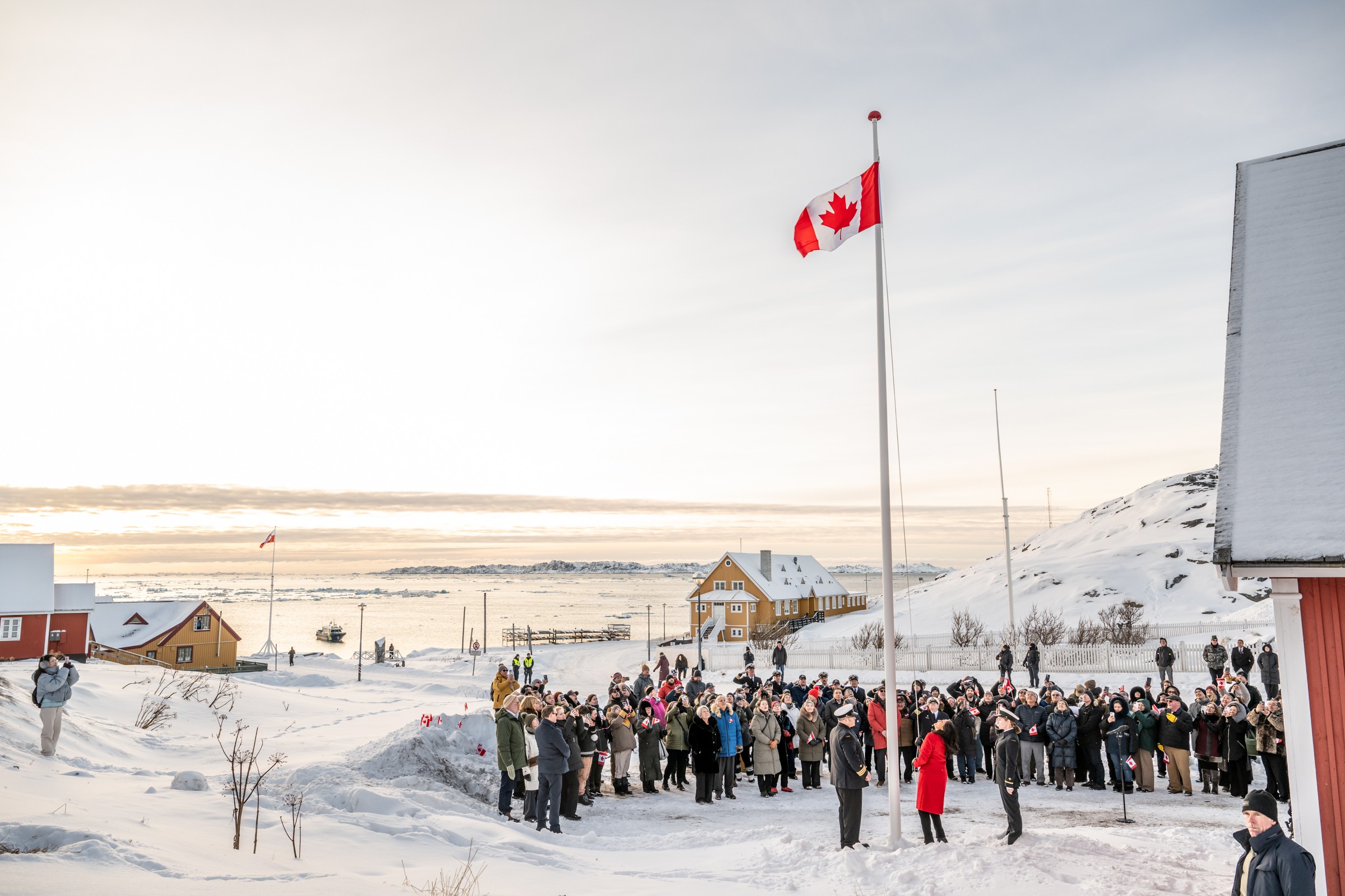 Ridicarea drapelului canadian la Nuuk, vineri, a avut însă o încărcătură diplomatică suplimentară: guvernatoarea generală Mary Simon — reprezentanta regelui în Canada — a fost prezentă, alături de spărgătorul de gheață al Gărzii de Coastă canadiene Jean Goodwill, ancorat în portul pitoresc al orașului.