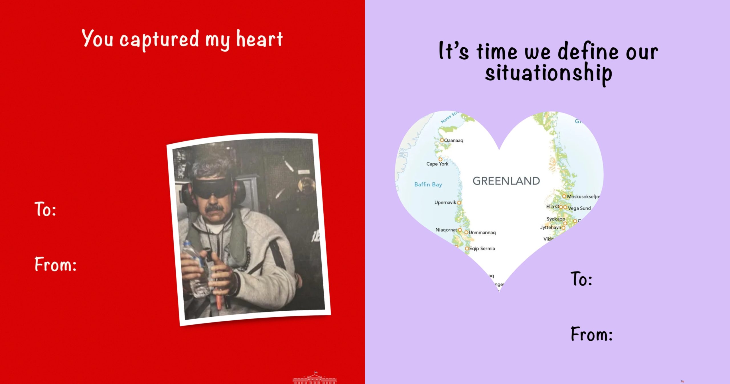 Una dintre felicitări îl prezintă pe fostul președinte venezuelean Nicolás Maduro, care a fost capturat în Caracas și dus în Statele Unite la începutul anului 2026.