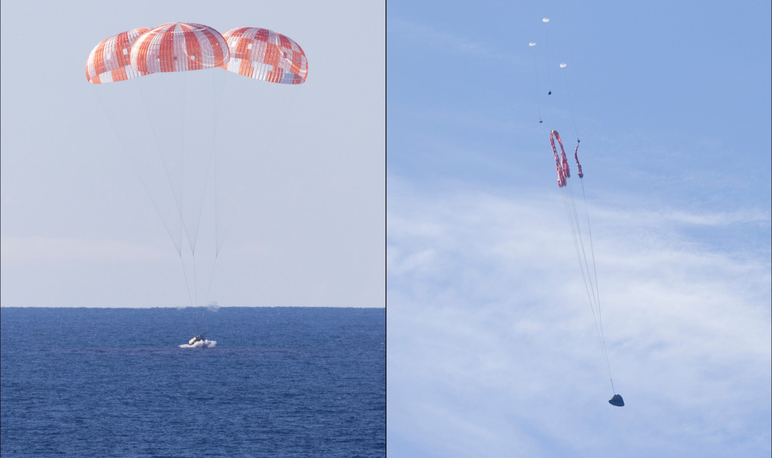 După traversarea zonei de blackout comunicațional, parașutele de stabilizare s-au deschis la aproximativ 6.700 de metri altitudine, reducând viteza capsulei. Ulterior, cele trei parașute principale au încetinit coborârea până la o amerizare controlată și sigură în Pacific.