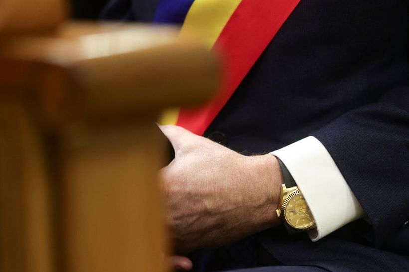 Este vorba despre un Rolex Day-Date („President”), unul dintre cele mai cunoscute modele ale producătorului elvețian, realizat exclusiv din metale prețioase.