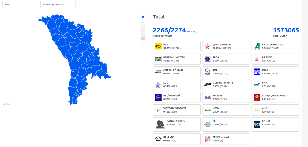 Cu peste 99,6% din buletinele de vot numărate și redistribuirea voturilor pentru partidele care nu au atins pragul electoral încă nefinalizată, PAS este mult înainte, cu peste 50% din voturi, față de 24,3% obținute de Blocul Electoral Patriotic (BEP), pro-rus.