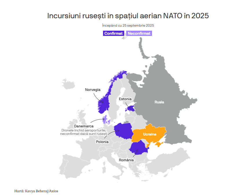 - Ministrul francez de Externe, Jean-Noël Barrot, a declarat pentru Axios că Franţa vrea să discute „întărirea regulilor de angajament”, dar „probabil nu până la punctul de a doborî un avion” care pătrunde în spaţiul NATO, aşa cum s-a întâmplat cu Estonia.