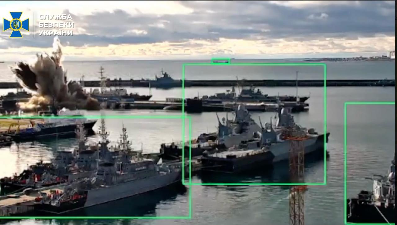 Serviciul de securitate ucrainean a publicat pe rețelele de socializare un videoclip care arată o presupusă explozie a unui submarin în port.