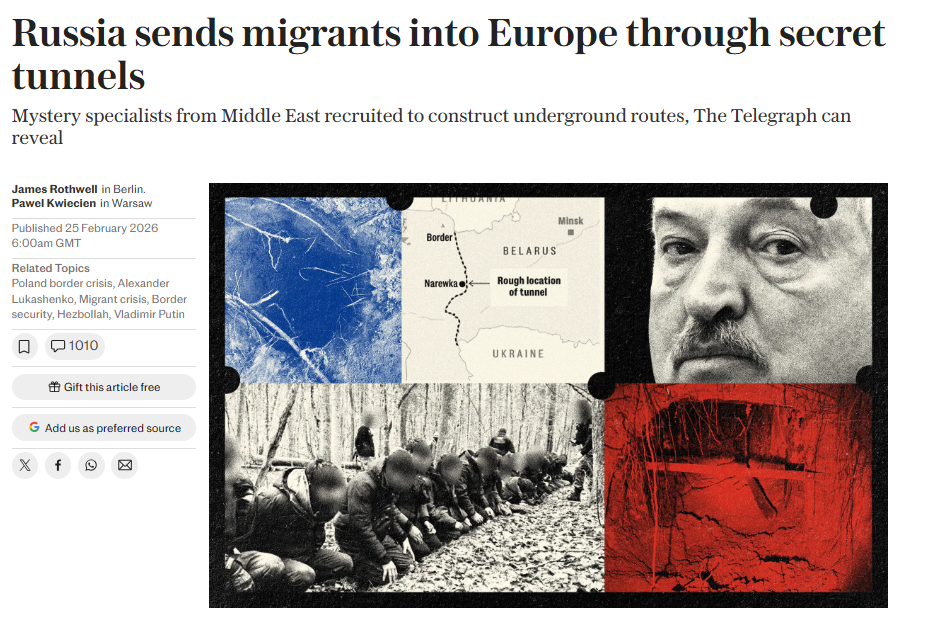 În 2025, la granița dintre Belarus și Polonia au fost descoperite patru tuneluri subterane, prin care străinii erau introduși ilegal în masă în Europa. Grănicerii polonezi au raportat acest lucru ziarului britanic The Telegraph.