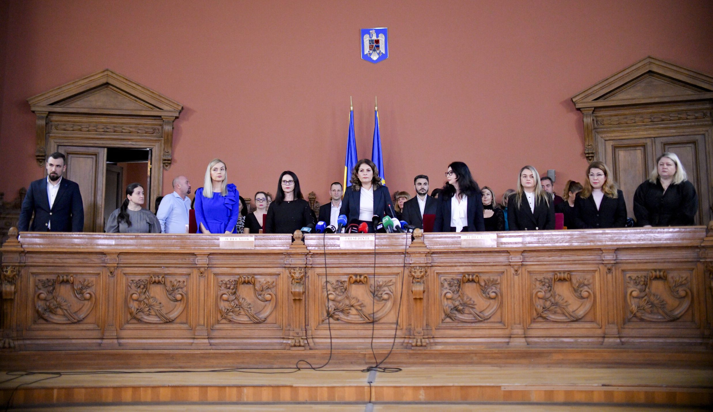 În spatele conducerii instanței s-au aflat, în picioare, magistrați chemați special pentru a oferi susținere publică. Conducerea CAB le-ar fi cerut tuturor judecătorilor aflați la serviciu în acel moment să participe la conferință.